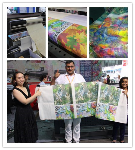 虽然展会期间阴雨不断,但客户的热情却从未减半,大家纷纷冒雨前来,众多客户带着非常明确的目标来到展会,他们大大的旅行袋里塞满了要打样印的样品,希望在现场就可以找到自己面料匹配的设备与方案。印度客户的棉布与毛巾,巴基斯坦客户没有上浆的棉布,国内客户的雪纺,我们在展会上都一一热情耐心地为他们现场测试。事实证明,我们的机器具有非常强的面料适应性,在极短的时间内,我们不需要做太多的调试,几乎可以随性轻松更换材料,在极短的时间内让客户收到了意想不到的效果,对我们的设备赞赏有嘉。